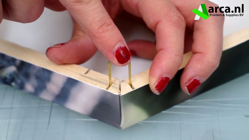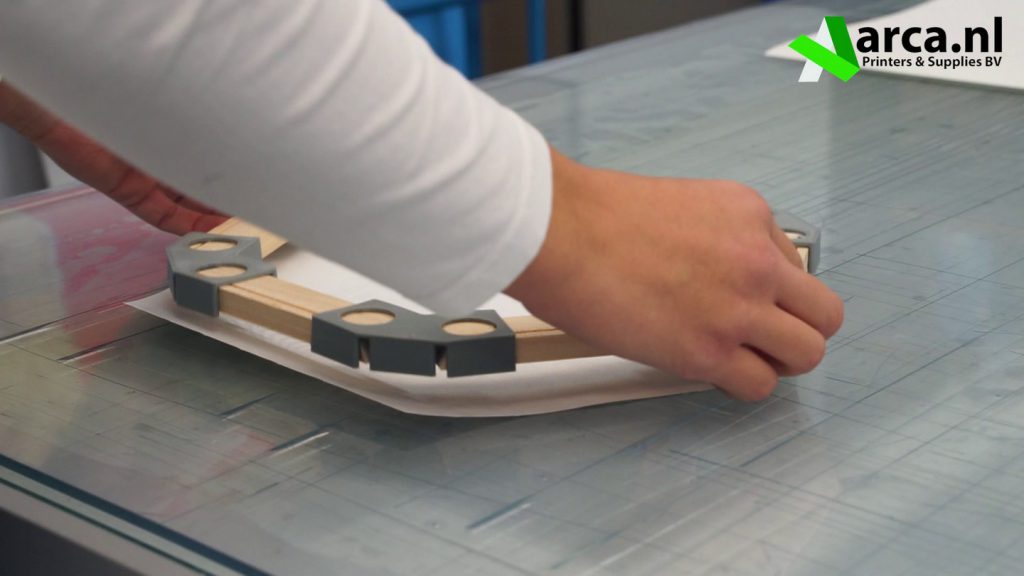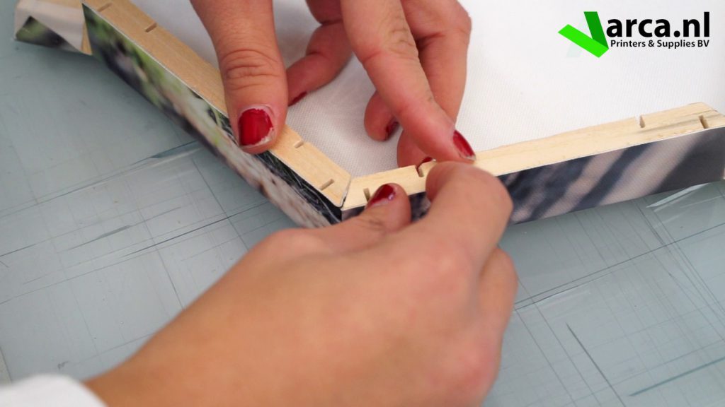 Wanneer het frame goed over het canvas ligt drukt u de latjes naar beneden in de hoeken. Herhaal dit tot u alle hoeken heeft gehad.