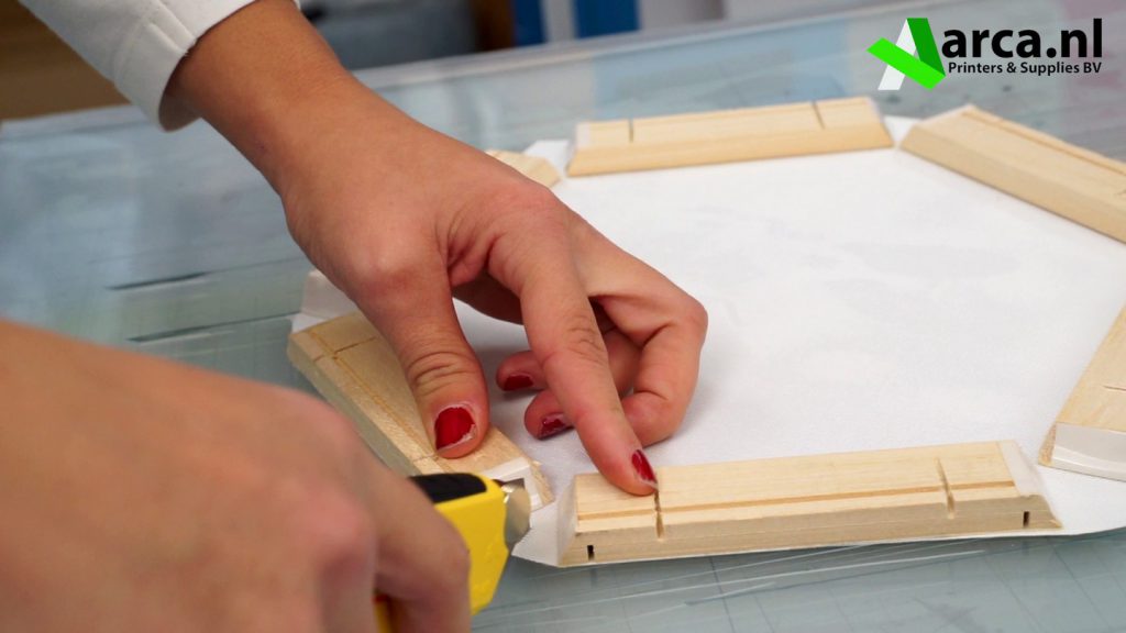 Snij het overtollige canvas weg met uw mes. Snij ook de hoeken van het canvas in, zodat ze straks naar binnen gevouwen kunnen worden.