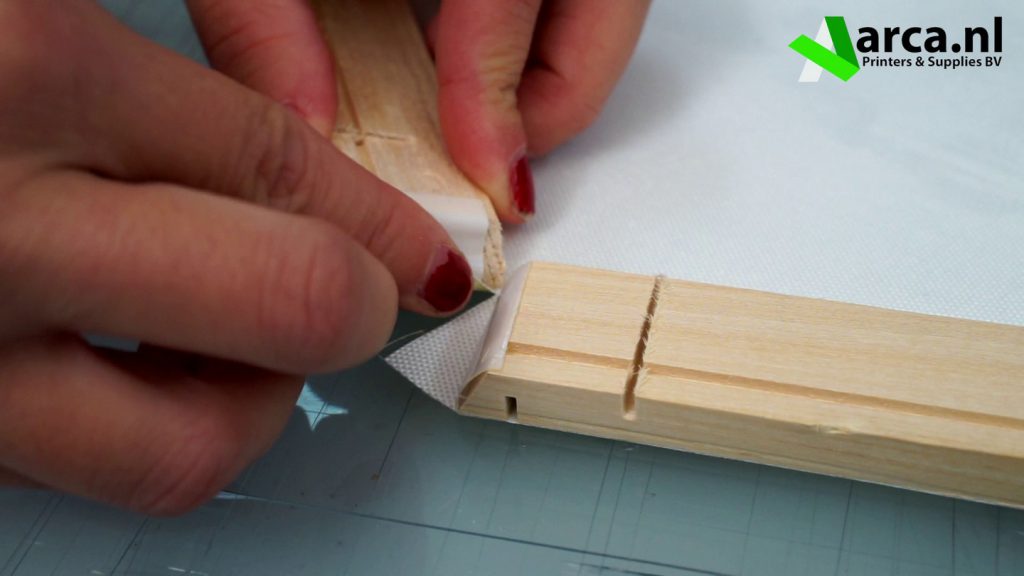 Vouw de hoekjes om tegen de plakraden van de latjes. Herhaal dit tot alle hoekjes vast geplakt zijn. Let op: hoe strakker u plakt, hoe netter uw canvas wordt en des te minder de naden straks opvallen.