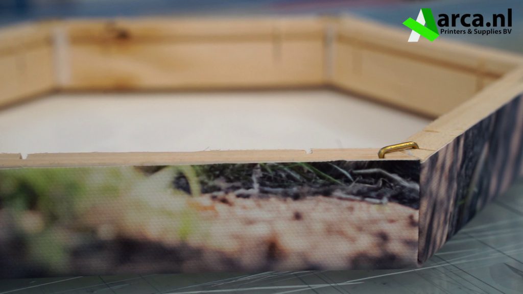Snij het canvas rondom uit langs de randen van de print. Wanneer u het canvas rondom hebt schoongesneden kunnen we door naar de volgende stap.