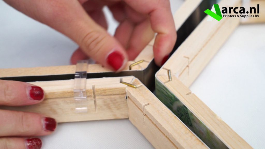 Vouw nu de laten tegen elkaar en druk de ijzeren beugeltjes (die meegeleverd worden met de latten) in de gleufjes. U kunt eventueel een hamertje gebruiken om de verbinding extra stevig te maken. Herhaal dit rondom en zo is uw canvas in een handomdraai opgespannen en heeft u meteen een zeshoek als resultaat.