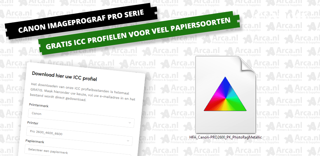 Bij elke Canon printer kunt u bij het aanvragen van een offerte een extra set inkt aanvragen tegen een aantrekkelijke prijs. Zo kunt u direct starten met printen en komt u niet zonder inkt te zitten. Daarnaast bieden we gratis ICC-profielen aan voor een groot aantal fine art papieren en canvas uit ons assortiment, zodat je altijd het maximale uit je printer haalt. Ook na levering kun je uiteraard rekenen op onze technische ondersteuning en deskundig advies. Meer weten? Vraag direct meer info.