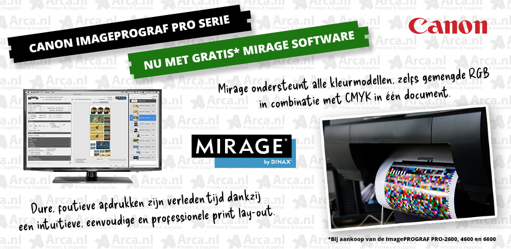 Mirage is de meest geavanceerde professionele Print Plug-In voor zeer uiteenlopende toepassingen, zoals Adobe Photoshop, Illustrator en InDesign. Mirage is ontworpen om professionele gebruikers, zoals grafimediabedrijven, kunstenaars en fotografen, sneller en efficiënter te laten werken en biedt de hoogste printkwaliteit in een eenvoudige, snelle en flexibele oplossing. Mirage brengt uw creatieve projecten tot leven dankzij geweldige flexibiliteit, zonder lengterestricties. En het mooiste is dat u deze unieke software nu tijdelijk gratis krijgt bij aankoop van een grootformaat Canon printer.